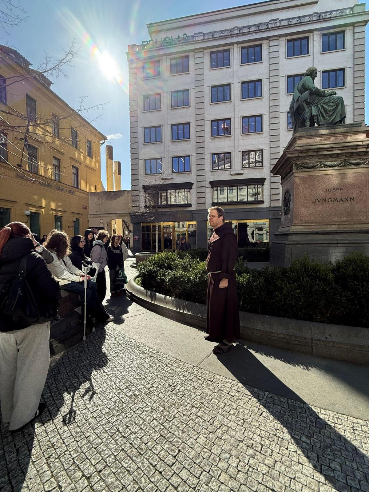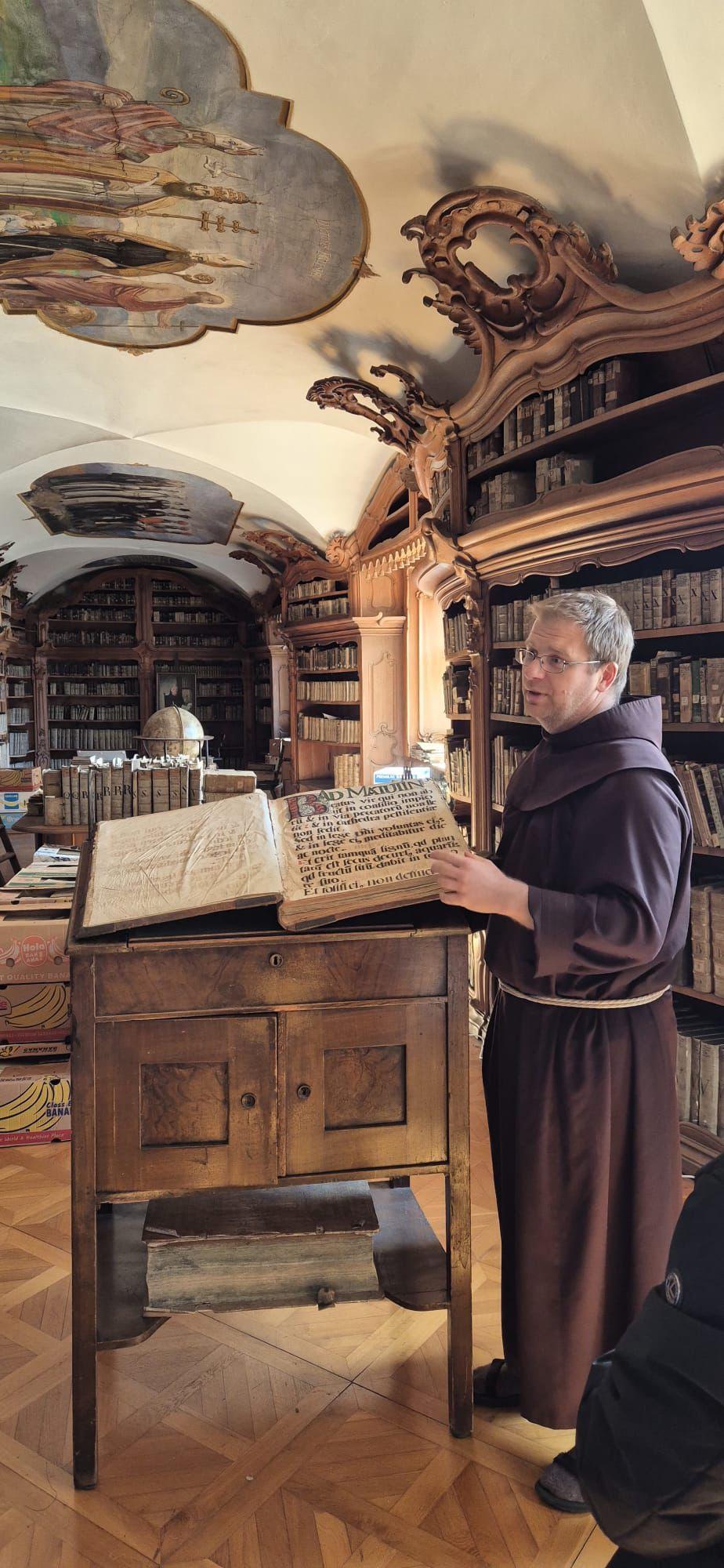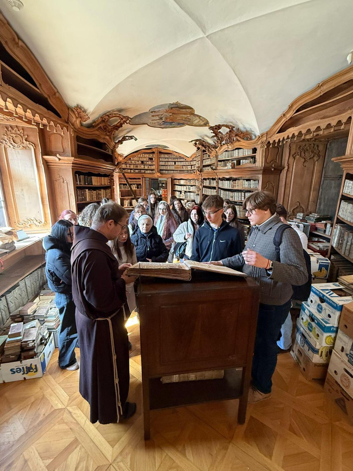 Studenty knihovnou provedl bratr Ondřej Čapek Bonaventura, kterému tímto děkujeme za odborný výklad a možnost nahlédnout do těchto výjimečných prostor.