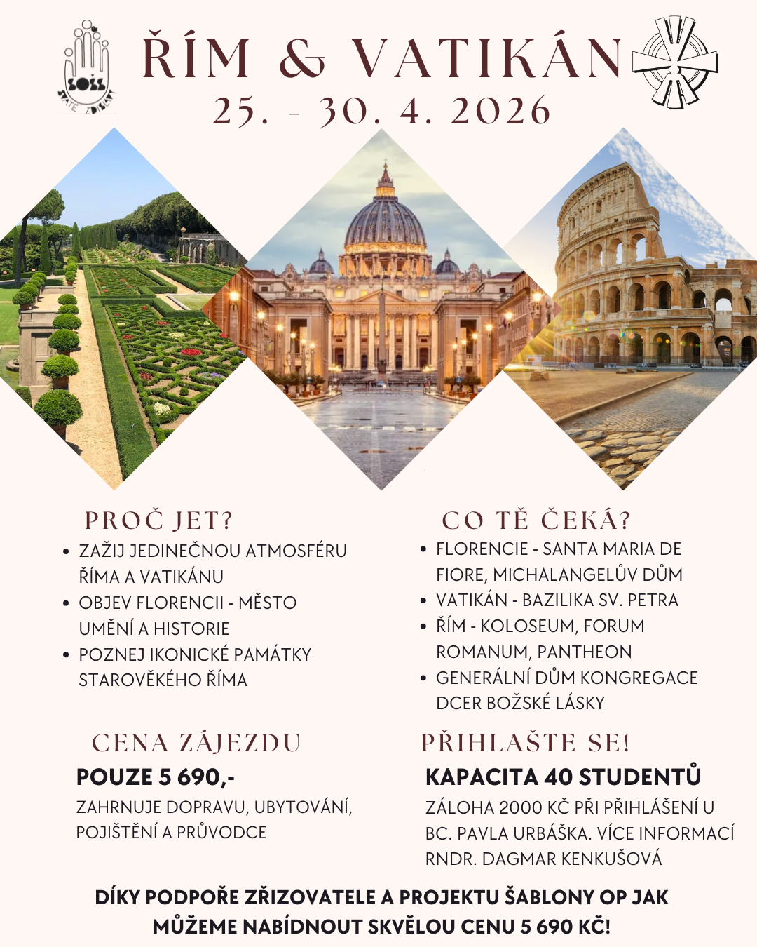Střední odborná škola sociální svaté Zdislavy pořádá studijně-poznávací zájezd do Říma, Vatikánu a Florencie, který se uskuteční v termínu 25.–30. 4. 2026.