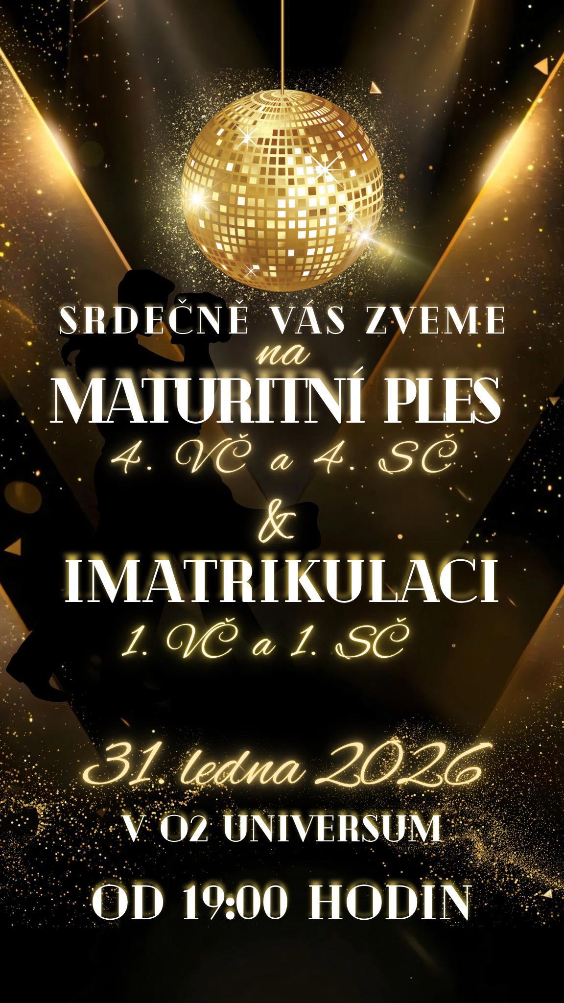 Maturitní ples, který proběhne společně s imatrikulací 1. VČ a 1. SČ.